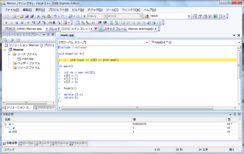 以下の簡単なソースコード #include <iostream> void hoge(int *x) { std::cout << x[0] << std::endl; } int main() { int *x = new int[3]; x[0] = 1; x[1] = 2; x[2] = 3; hoge(x); delete [] x; return 0; } のようにポインタを引数にとる関数の中をデバッグしてい</iostream>…